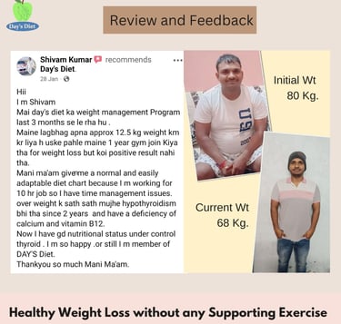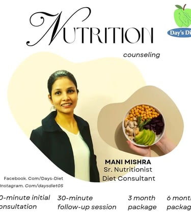 At Day's Diet , we provide customized Indian diet plans crafted by experienced senior dietician Mani Mishra, who has over 15 years of expertise in nutrition and wellness.