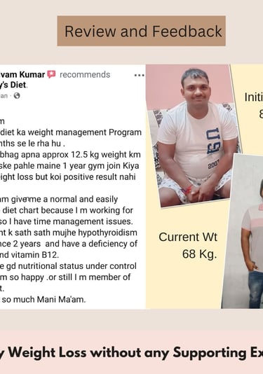 "Mani Mishra's personalized Indian diet plans transformed my health in just 3 months. With tailored meal plans for weight management, therapeutic support, and emotional counseling, her expertise promotes sustainable weight loss, mental wellness, and holistic health for a happier you!"